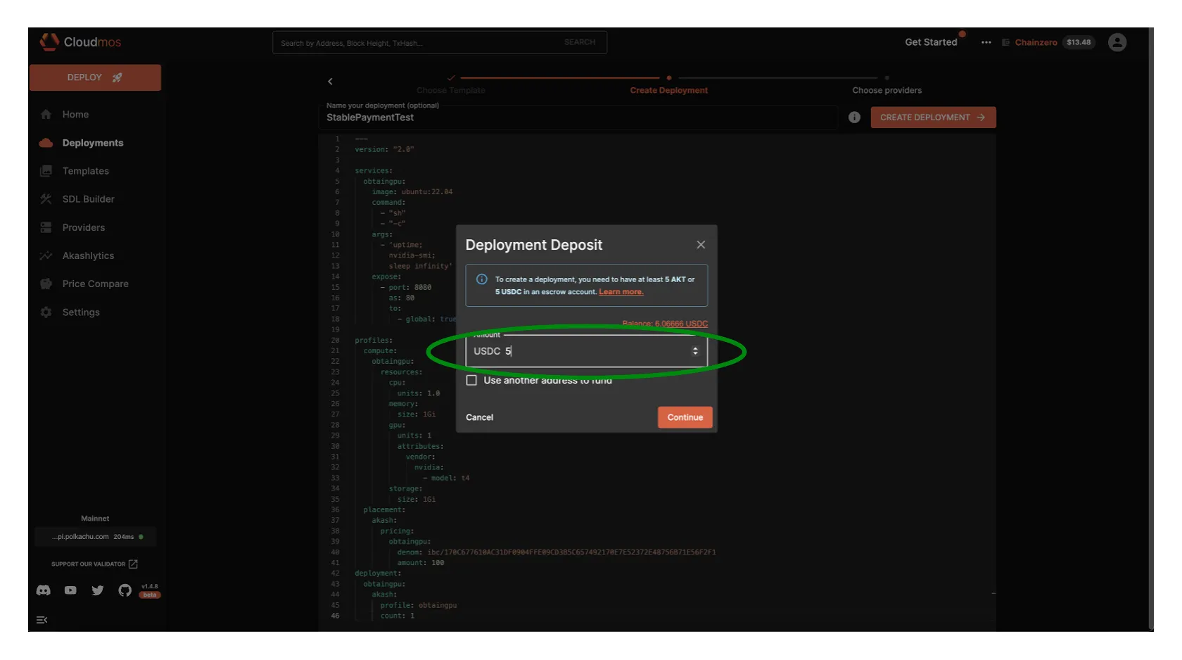 - When the associated SDL uses the USDC denomination, Akash Console will create the deployment with Stable Payment.