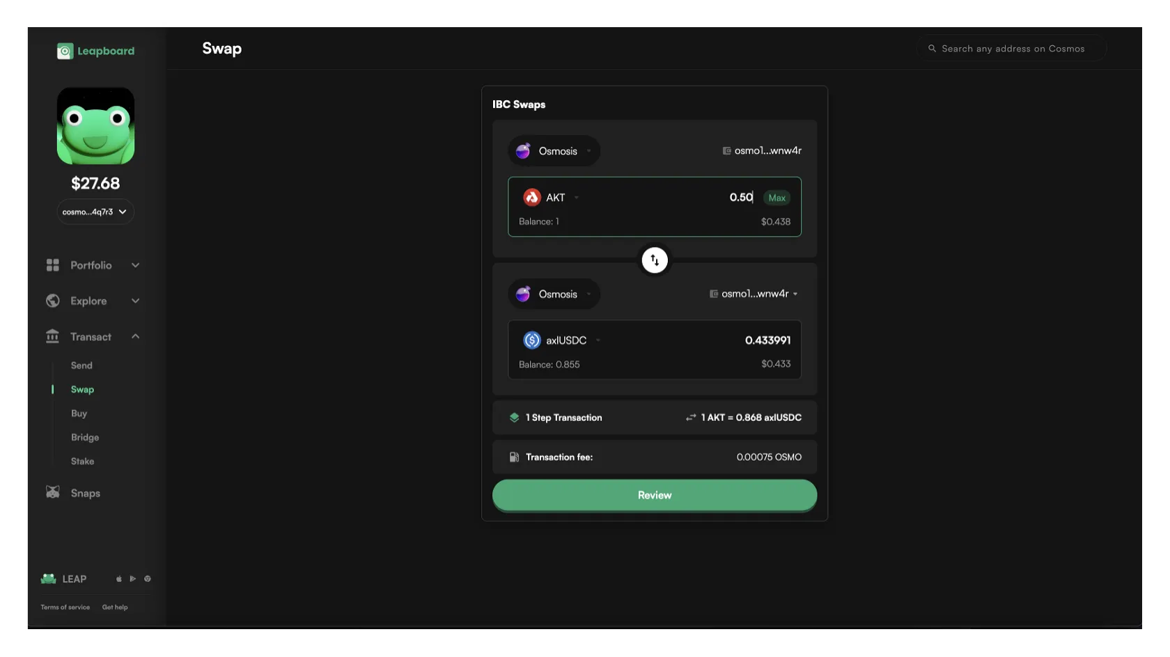 - The selection of the Swap option in the prior step will provoke the opening of the Leap Wallet web app