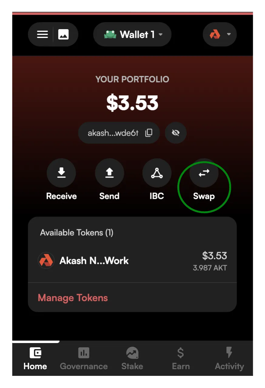NOTE - in the current Leap Wallet version swaps of AKT to axlUSDC are only possible in the web app. Via the instructions below you will be automatically redirected to the Leap Wallet app for the purpose of AKT to axlUSDC swap. In future versions of Leap Wallet it may become possible to conduct the swap directly within the Leap Wallet browser plug in.