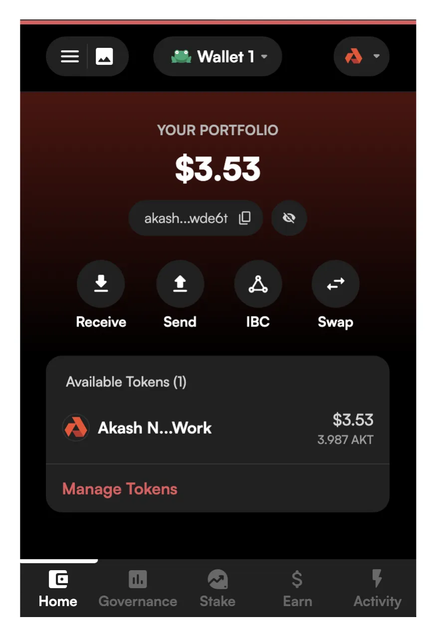 - Select Akash from the network selection drop down as shown