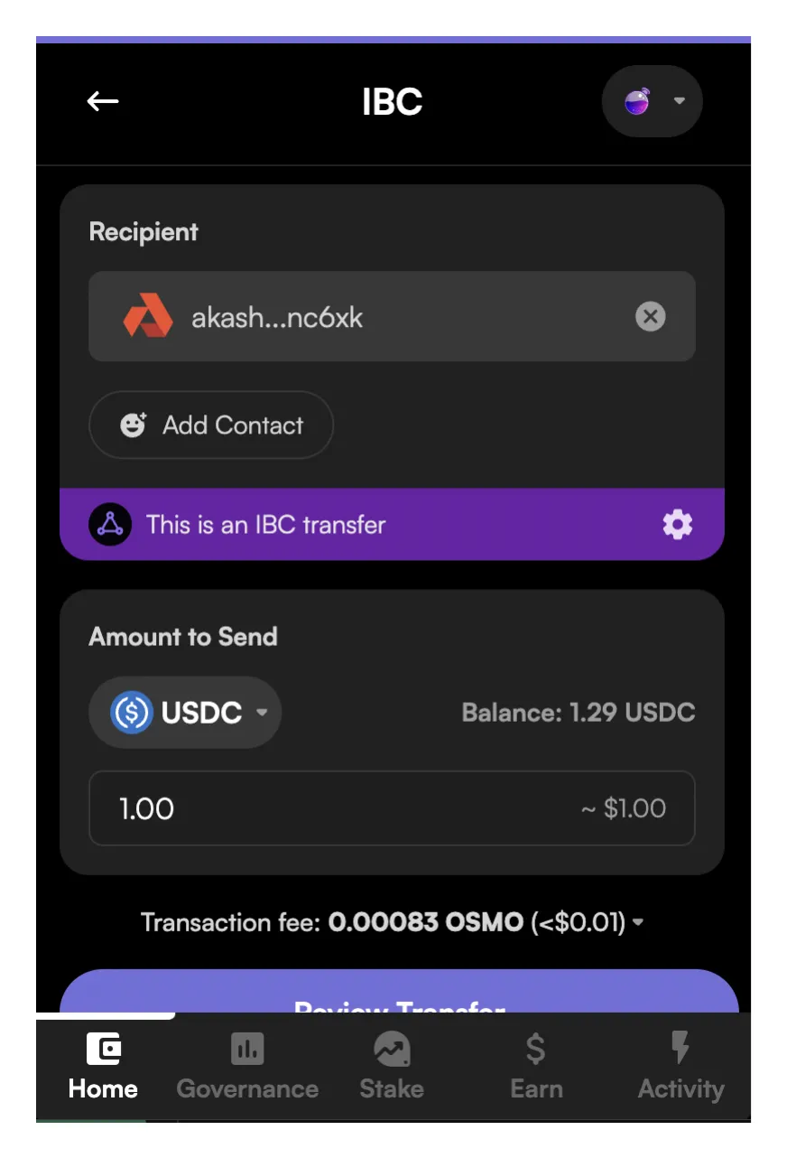 Transfer USDC onto Akash using Leap Wallet