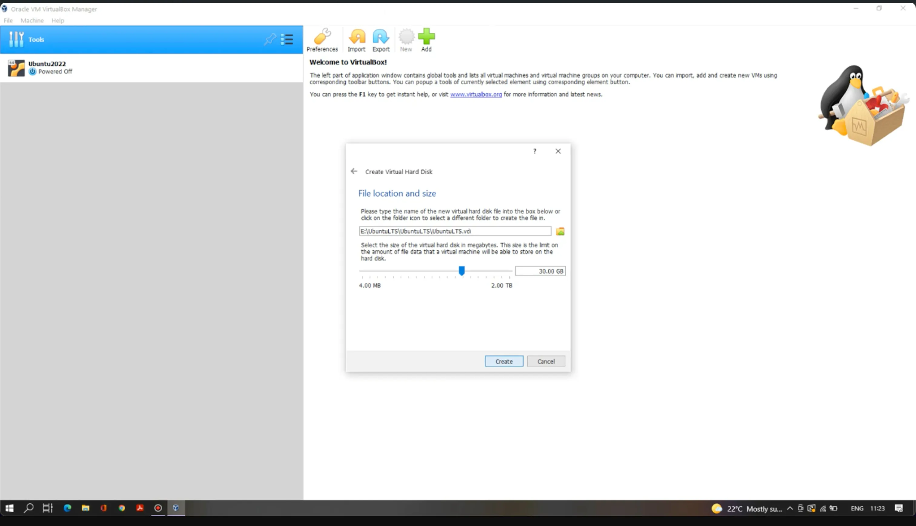 Click Next and set the virtual hard disk size (minimum required is 30 GB).