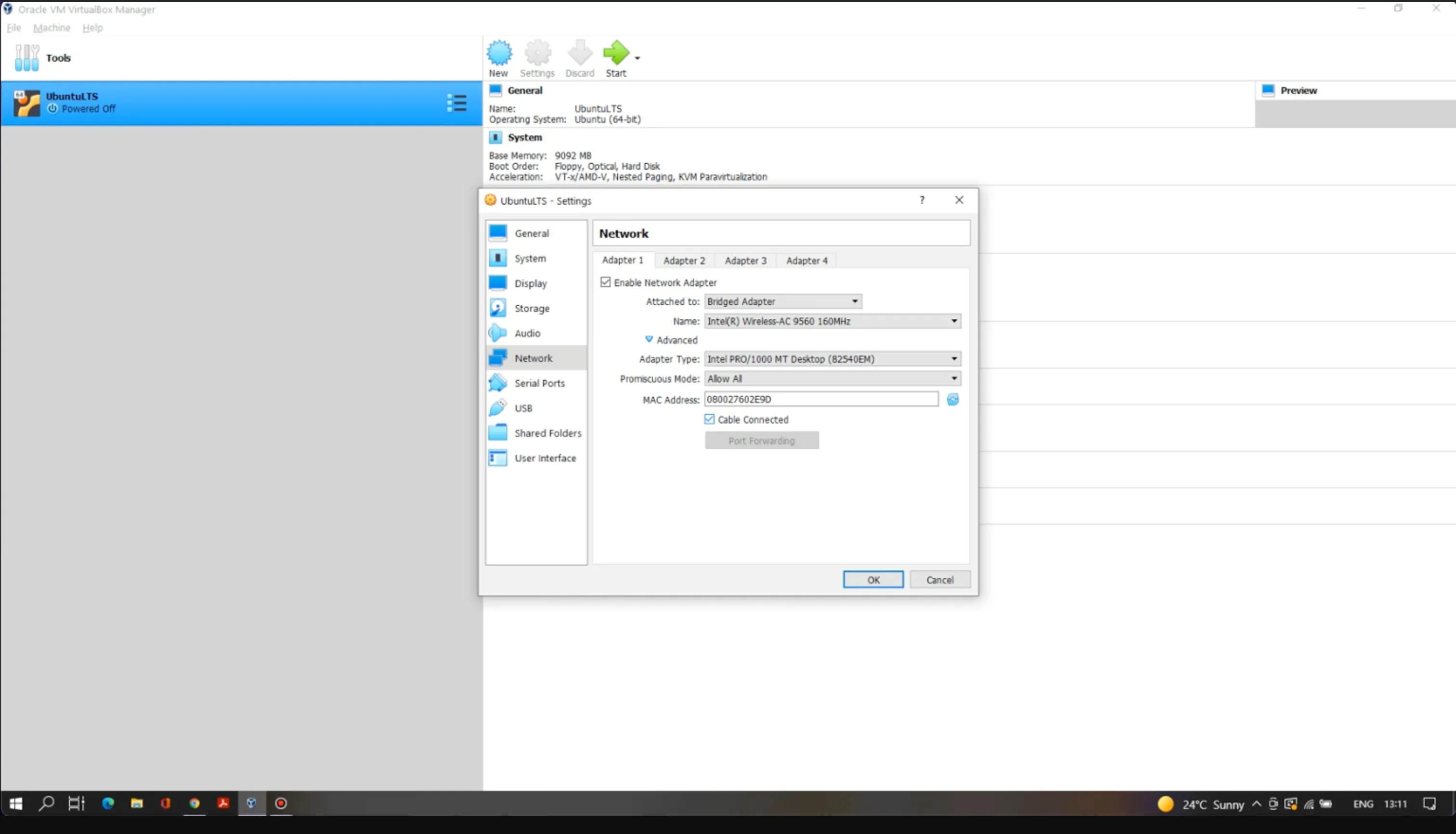In the Network section, go to the Adapter 1 tab and select “Bridged Adapter” under the “Attached to” label.