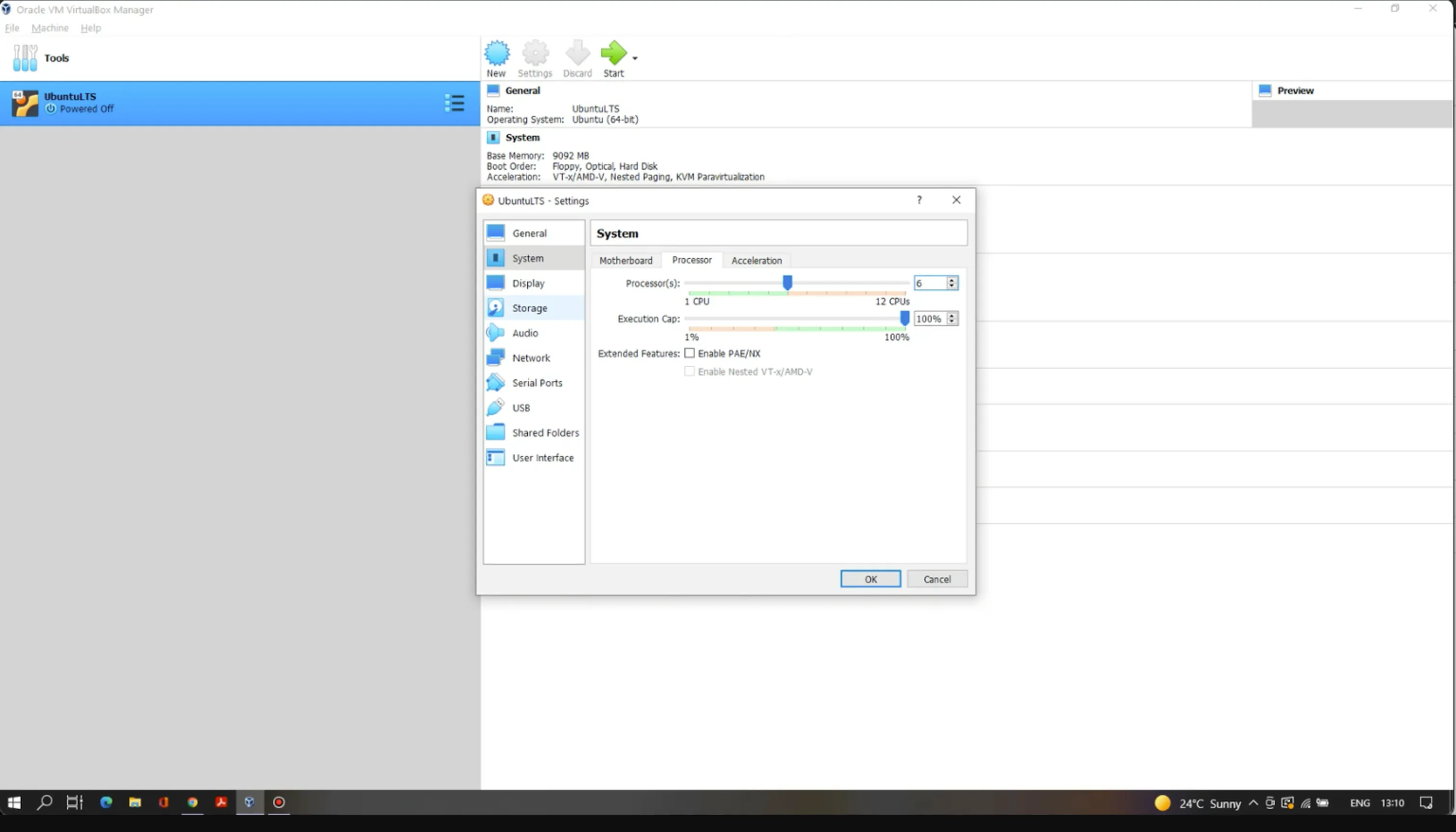 In the System section, go to the Processor tab and set the Processor(s) to at least 2 CPUs.