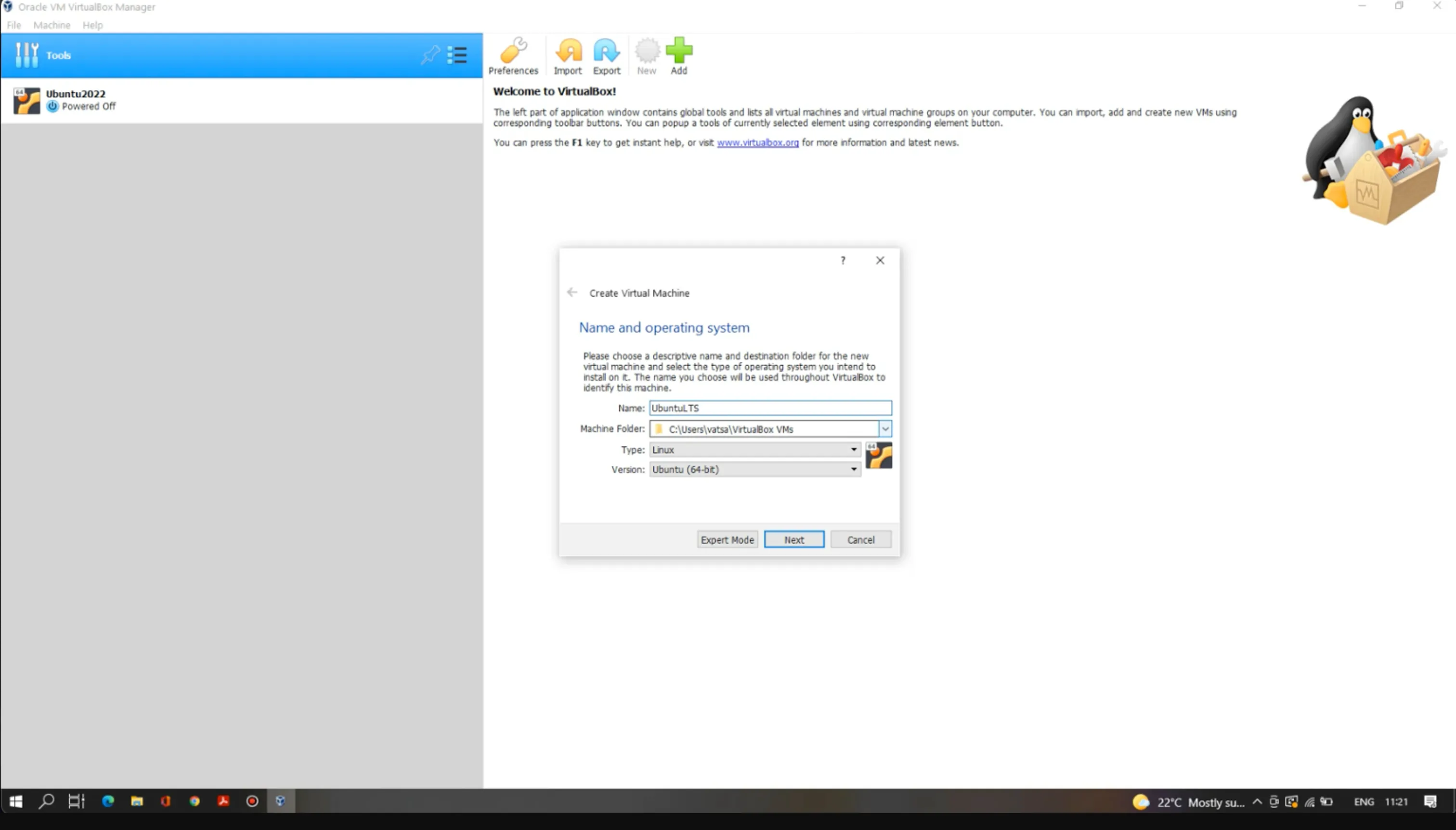 Provide a name and path for the VM. Select the operating system type “Linux” and the version “Ubuntu” based on your computer’s architecture.