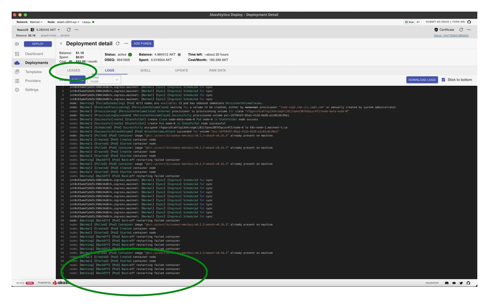 - If a deployment’s escrow runs out of funds (0 AKT), the lease will be closed by the provider. Consider increasing the initial deposit to an amount that will be enough to fund the deployment for some time. And/or consider a strategy to ensure the escrow is re-funded on a periodic basis to ensure no disruption to your validator.